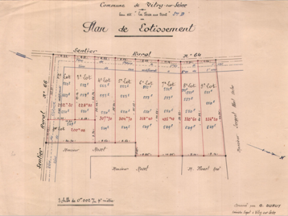 Commune de Vitry-sur-Seine, Lieu-dit « La Fosse aux Fiens » (section D), Plan de lotissement, dressé par G. Duhuy géomètre expert à Vitry-sur-Seine, sd. (XXe siècle) : Très intéressant pour l’analyse des limites lors d’un bornage, ce document, issu des archives de l’agence TTGE 94, conserve également la mémoire d’une appellation attestée dès le XVe siècle à Vitry-sur-Seine : la « Fosse aux Fiens », littéralement : la Fosse à m****e[4].
