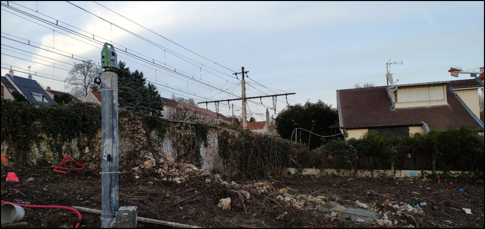 Dans le cadre de travaux de construction de 108 logements en 4 bâtiments R+4 avec parking à Savigny-Sur-Orge, l’entreprise principale a sollicité TT Géomètres Experts afin de proposer une solution d'auscultation automatique du mur de soutènement des voies du RER C à proximité immédiate des travaux pour la durée du chantier. La zone à surveiller couvre 100m linéaire de mur au droit du projet.