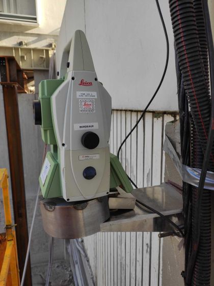 Un théodolite automatisé (TM50) a alors été installé au cours du mois de janvier 2024 pour une durée initiale de 3 mois. Les cibles en hauteur ont été mis en place à l’aide d’une nacelle par nos équipes habilitées à la conduite d’une PEMP.