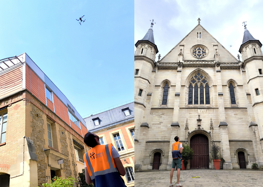 Pendant la phase d’acquisition par drone, une équipe de cordiste, présente sur place pour une mission de réfection du patrimoine, a sollicité notre aide pour voir certains éléments sur les toitures. Nous les avons donc épaulés avec plaisir le temps d’un midi. Cette anecdote démontre la complémentarité de notre métier avec d’autres professions.